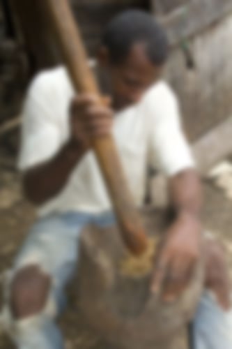 Hier werden die Silberhäutchen der Kaffeebohne im Mörser durch leichtes Stampfen gelöst und durch Luftsieben entfernt.